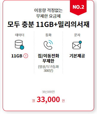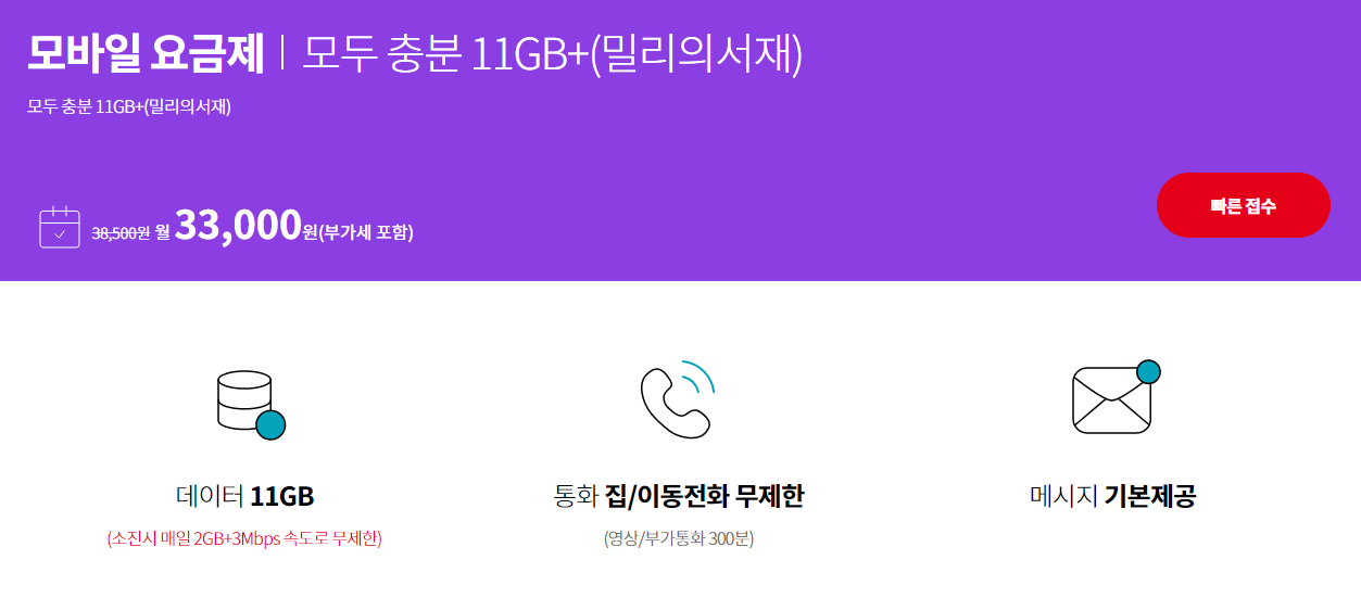 - 데이터는 기본 11GB 소진 시 하루 2GB씩 추가 사용이 가능, 2GB 초과 사용 시 최대 3 Mbps 속도 데이터로 이용 가능