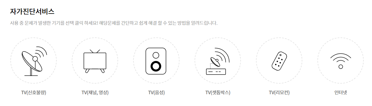 현재 스카이라이프 고객센터 홈페이지에서는 위의 사진처럼 6개의 큰 부분으로 나눠 해당 문제를 쉽게 해결할 수 있는 방안을 자가진단 서비스로 제시하고 있습니다.