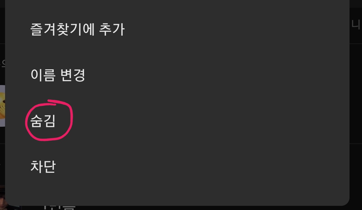 - 4가지의 선택 메뉴 중 숨김을 클릭합니다.