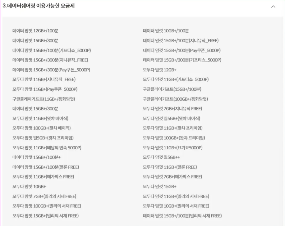 | 요금제 명 | 가격 | 데이터 | 통화 | 문자 | 혜택 | 아무나 결합 | 데이터셰어링 |