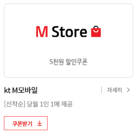 kt m 모바일을 사용하시면 다양한 쿠폰들도 함께 사용 가능한데 아무래도 처음 개통할 때만 홈페이지에 막 들어오지 그 다음부터는 잘 들락날락하지 않아서 까먹거나 아니면 아예 처음부터 쿠폰 기능이 있는지 모를 수도 있겠더라구요. 그래도 상당히 쓸만한 쿠폰들이 많아요.